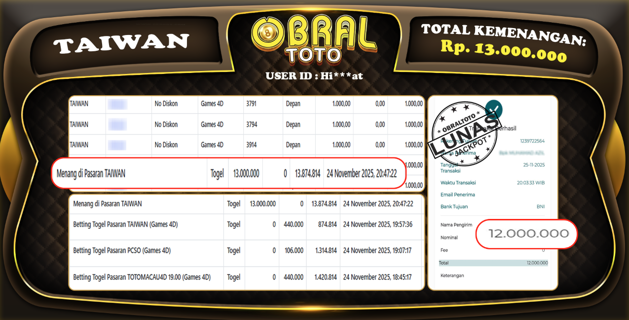 Kami merayakan selamat kepada salah satu pemain setia situs OBRALTOTO yang berhasil meraih kemenangan besar senilai Rp,13.000.000 dalam permainan TAIWAN pada tanggal 25 November 2025. Kemenangan ini telah kami proses dan pemahaman secara LUNAS ke rekening yang terdaftar. Semoga kemenangan ini menjadi motivasi bagi pemain lainnya untuk terus mencoba keberuntungan dan menikmati permainan di OBRALTOTO .