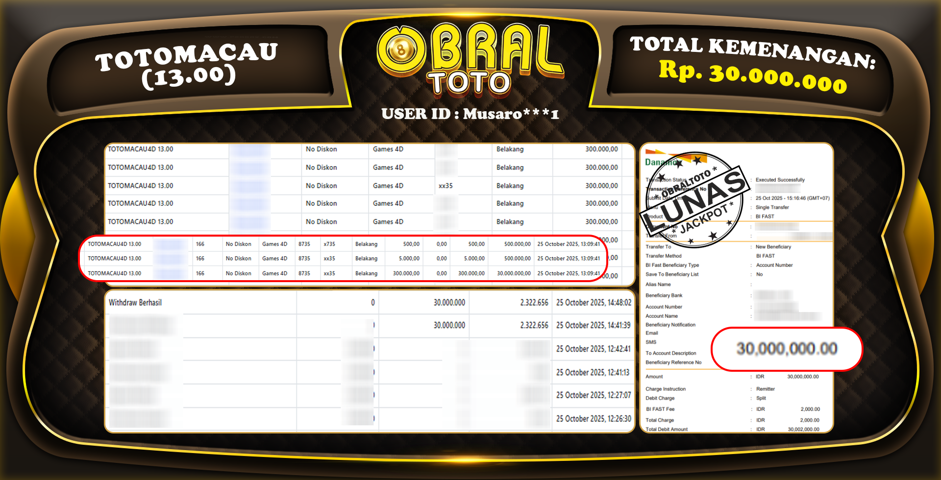 Kami merayakan selamat kepada salah satu pemain setia situs OBRALTOTO yang berhasil meraih kemenangan besar senilai Rp,30.000.000 dalam permainan TOTO MACAU4D pada tanggal 25 Oktober 2025. Kemenangan ini telah kami proses dan pemahaman secara LUNAS ke rekening yang terdaftar. Semoga kemenangan ini menjadi motivasi bagi pemain lainnya untuk terus mencoba keberuntungan dan menikmati permainan di OBRALTOTO .