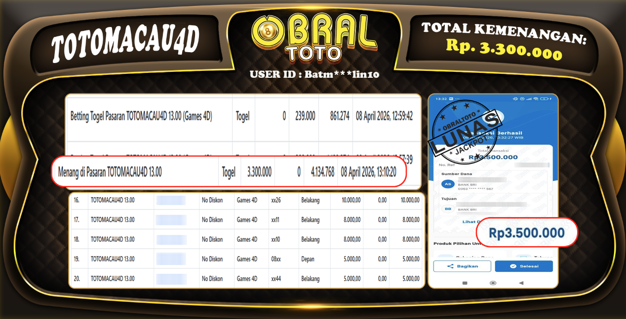 Kami merayakan selamat kepada salah satu pemain setia situs OBRALTOTO yang berhasil meraih kemenangan besar senilai Rp,3.300.000 dalam permainan TOTOMACAU4D pada tanggal 09 APRIL 2026. Kemenangan ini telah kami proses dan pemahaman secara LUNAS ke rekening yang terdaftar. Semoga kemenangan ini menjadi motivasi bagi pemain lainnya untuk terus mencoba keberuntungan dan menikmati permainan di OBRALTOTO .