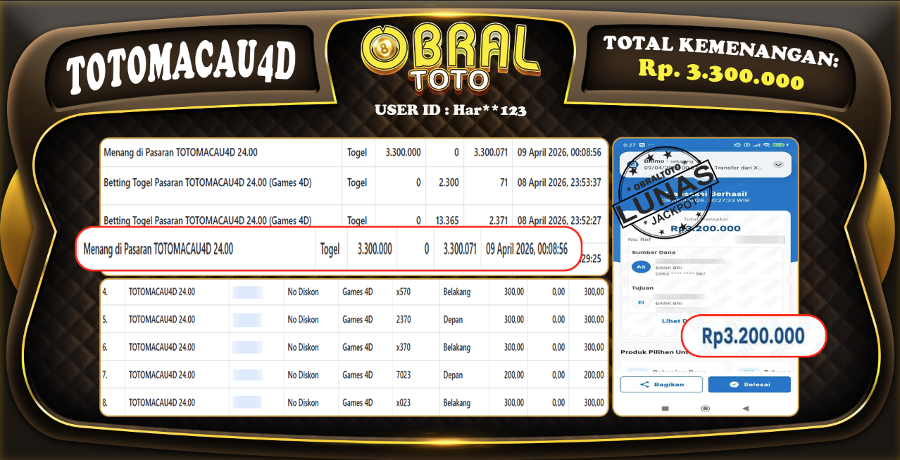 Kami merayakan selamat kepada salah satu pemain setia situs OBRALTOTO yang berhasil meraih kemenangan besar senilai Rp,3.300.000 dalam permainan TOTOMACAU4D pada tanggal 10 APRIL 2026. Kemenangan ini telah kami proses dan pemahaman secara LUNAS ke rekening yang terdaftar. Semoga kemenangan ini menjadi motivasi bagi pemain lainnya untuk terus mencoba keberuntungan dan menikmati permainan di OBRALTOTO .
