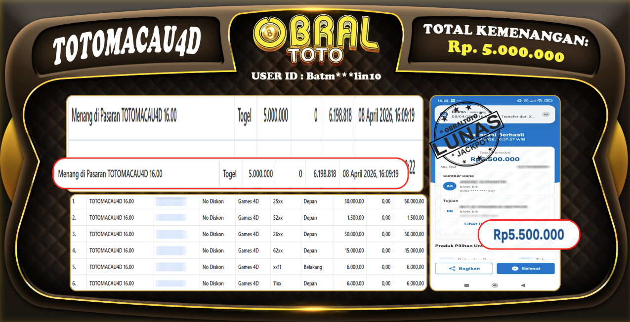 Kami merayakan selamat kepada salah satu pemain setia situs OBRALTOTO yang berhasil meraih kemenangan besar senilai Rp,5.000.000 dalam permainan TOTOMACAU4D pada tanggal 09 APRIL 2026. Kemenangan ini telah kami proses dan pemahaman secara LUNAS ke rekening yang terdaftar. Semoga kemenangan ini menjadi motivasi bagi pemain lainnya untuk terus mencoba keberuntungan dan menikmati permainan di OBRALTOTO .