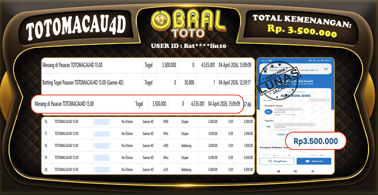 Kami merayakan selamat kepada salah satu pemain setia situs OBRALTOTO yang berhasil meraih kemenangan besar senilai Rp,6.050.000 dalam permainan TOTOMACAU4D 19.00pada tanggal 29 05 APRIL 2026. Kemenangan ini telah kami proses dan pemahaman secara LUNAS ke rekening yang terdaftar. Semoga kemenangan ini menjadi motivasi bagi pemain lainnya untuk terus mencoba keberuntungan dan menikmati permainan di OBRALTOTO .