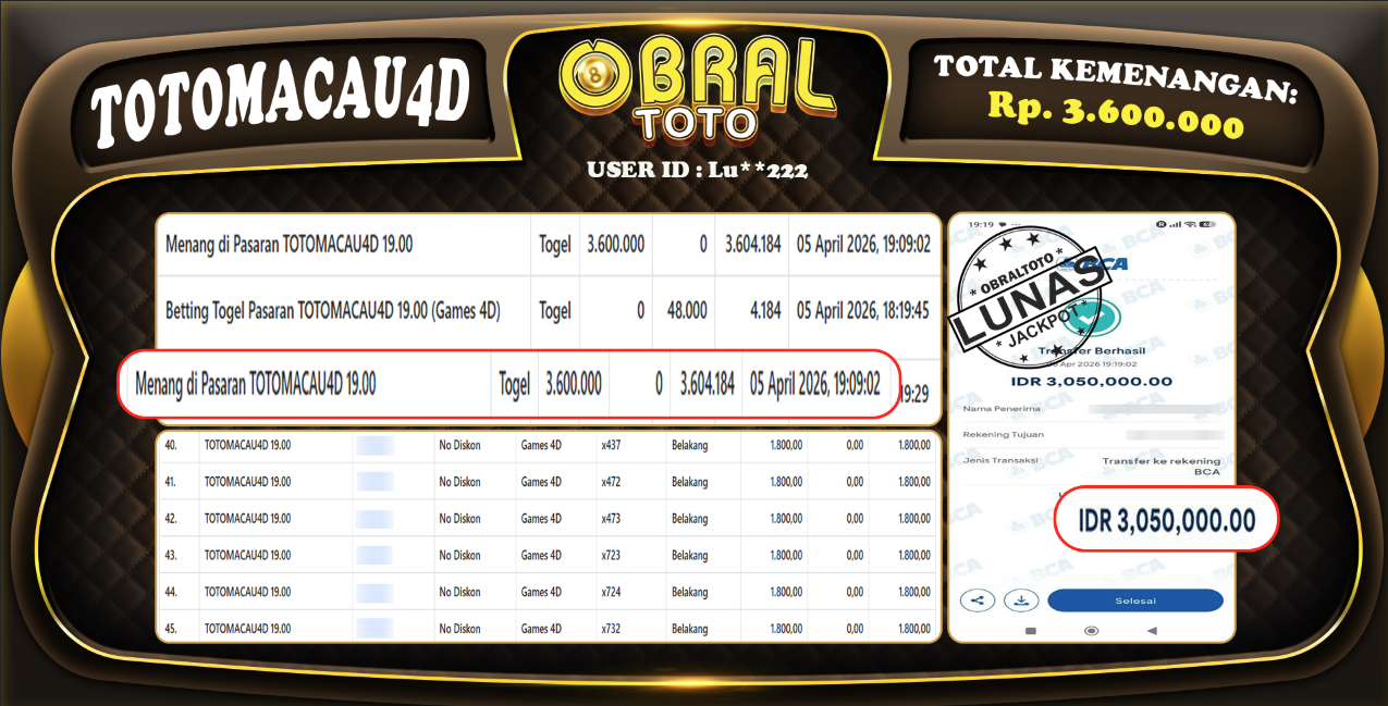 Kami merayakan selamat kepada salah satu pemain setia situs OBRALTOTO yang berhasil meraih kemenangan besar senilai Rp,6.050.000 dalam permainan TOTOMACAU4D 19.00pada tanggal 29 06 APRIL 2026. Kemenangan ini telah kami proses dan pemahaman secara LUNAS ke rekening yang terdaftar. Semoga kemenangan ini menjadi motivasi bagi pemain lainnya untuk terus mencoba keberuntungan dan menikmati permainan di OBRALTOTO .