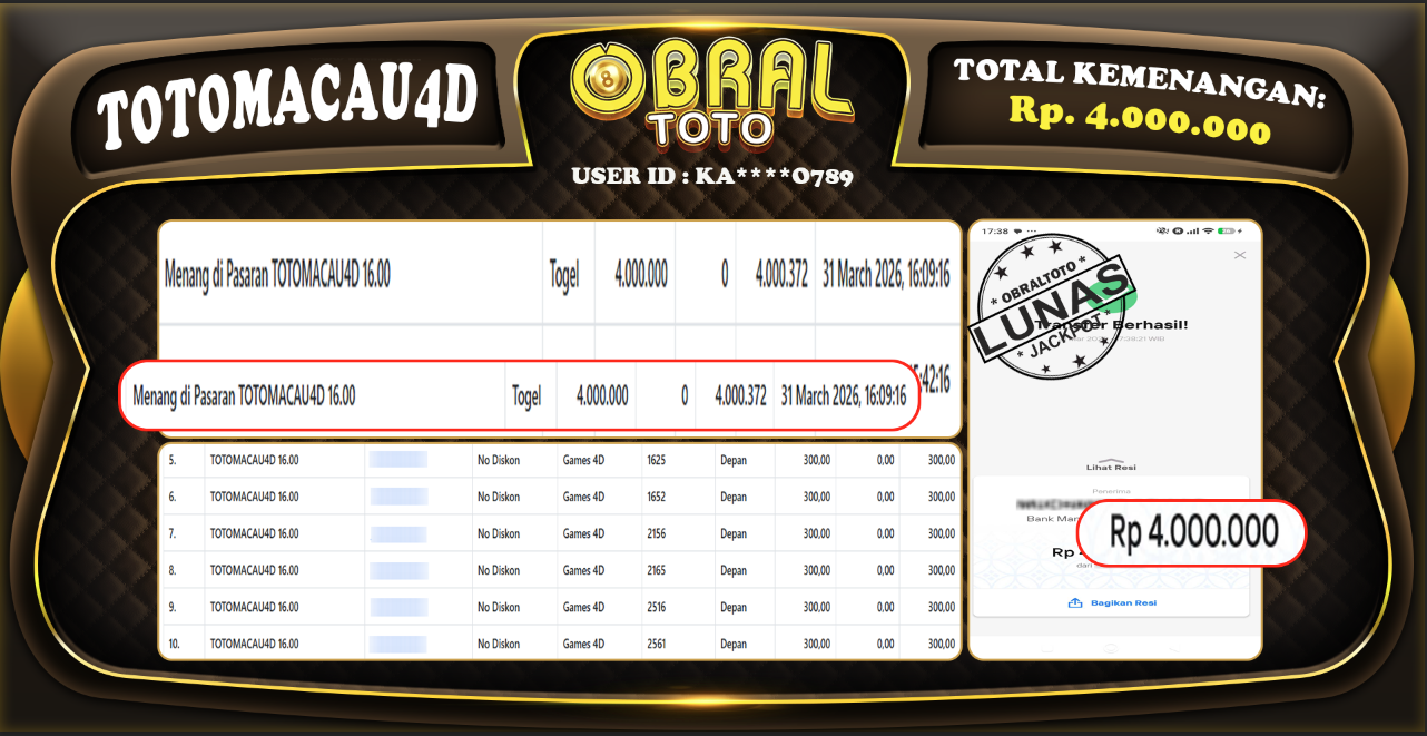 Bukti pembayaran lunas yang ditampilkan merupakan salah satu indikator bahwa situs OBRALTOTO adalah platform slot, togel, & casino yang sangat aman dan terpercaya. Dengan komitmen untuk membayar berapapun kemenangan yang diraih oleh para pemain, OBRALTOTO memastikan pengalaman bermain yang transparan dan memuaskan. Kepercayaan dan kenyamanan pemain adalah prioritas utama, sehingga setiap kemenangan Anda akan selalu dihargai dan dijamin secara penuh tanpa kendala.