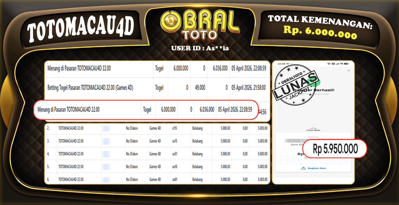 Kami merayakan selamat kepada salah satu pemain setia situs OBRALTOTO yang berhasil meraih kemenangan besar senilai Rp,6.050.000 dalam permainan TOTOMACAU4D 19.00pada tanggal 29 06 APRIL 2026. Kemenangan ini telah kami proses dan pemahaman secara LUNAS ke rekening yang terdaftar. Semoga kemenangan ini menjadi motivasi bagi pemain lainnya untuk terus mencoba keberuntungan dan menikmati permainan di OBRALTOTO .