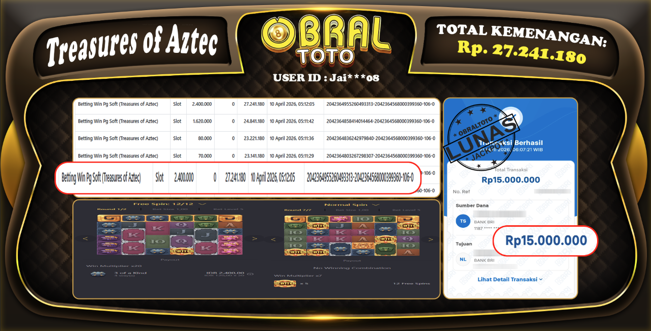 Kami merayakan selamat kepada salah satu pemain setia situs OBRALTOTO yang berhasil meraih kemenangan besar senilai Rp,4.100.000 dalam permainan TREASURES OF AZTEC pada tanggal 11 APRIL 2026. Kemenangan ini telah kami proses dan pemahaman secara LUNAS ke rekening yang terdaftar. Semoga kemenangan ini menjadi motivasi bagi pemain lainnya untuk terus mencoba keberuntungan dan menikmati permainan di OBRALTOTO .