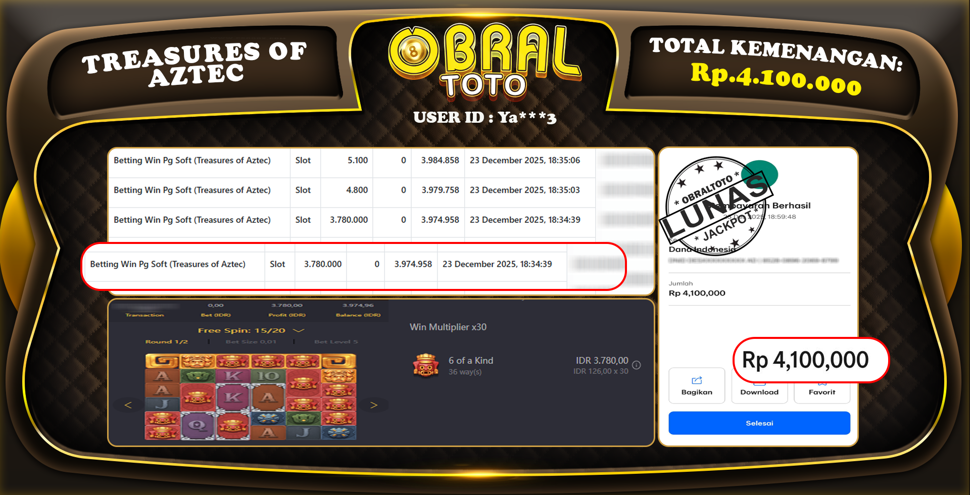 Kami merayakan selamat kepada salah satu pemain setia situs OBRALTOTO yang berhasil meraih kemenangan besar senilai Rp,4.100.000 dalam permainan TREASURES OF AZTEC pada tanggal 24 DESEMBER 2025. Kemenangan ini telah kami proses dan pemahaman secara LUNAS ke rekening yang terdaftar. Semoga kemenangan ini menjadi motivasi bagi pemain lainnya untuk terus mencoba keberuntungan dan menikmati permainan di OBRALTOTO .