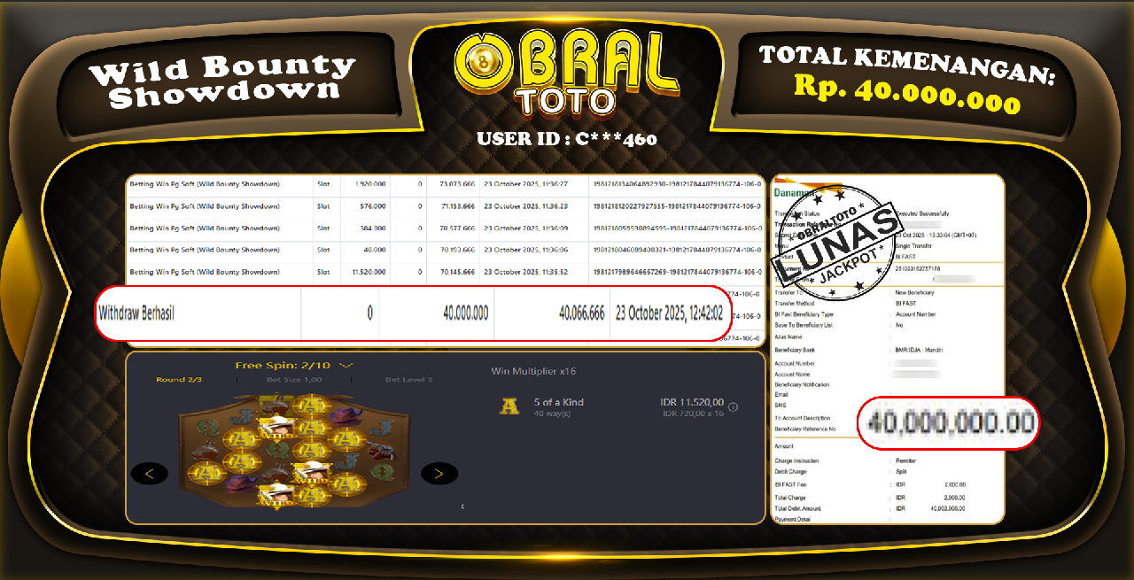 Kami merayakan selamat kepada salah satu pemain setia situs OBRALTOTO yang berhasil meraih kemenangan besar senilai Rp,40.000.000 dalam permainan WILD BOUNTY SHOWDOWN pada tanggal 24 Oktober 2025. Kemenangan ini telah kami proses dan pemahaman secara LUNAS ke rekening yang terdaftar. Semoga kemenangan ini menjadi motivasi bagi pemain lainnya untuk terus mencoba keberuntungan dan menikmati permainan di OBRALTOTO .