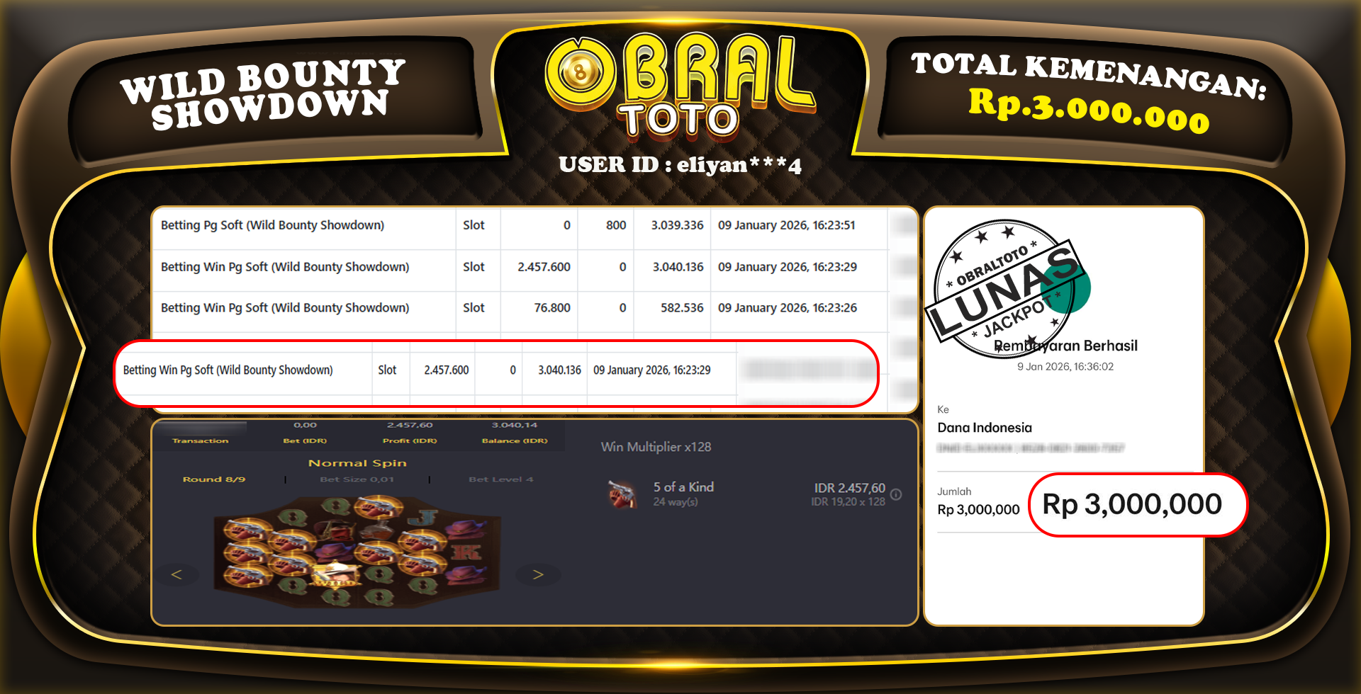 Kami merayakan selamat kepada salah satu pemain setia situs OBRALTOTO yang berhasil meraih kemenangan besar senilai Rp,3.000.000 dalam permainan WILD BOUNTY SHOWDOWN pada tanggal 10 JANUARY 2026. Kemenangan ini telah kami proses dan pemahaman secara LUNAS ke rekening yang terdaftar. Semoga kemenangan ini menjadi motivasi bagi pemain lainnya untuk terus mencoba keberuntungan dan menikmati permainan di OBRALTOTO .